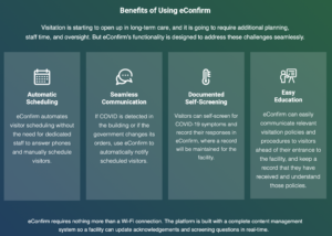 While eConfirm was designed in response to COVID, we know that it has benefits for long-term use in the long-term care industry. Future visitation is going to look different and require the use of a tool like eConfirm to ensure continued screening and credentialing of whoever comes through your doors. We are also building components to assist with marketing tasks, such as auto-scheduling tours and marketing visits. The future of communication is digital, and eConfirm will help facilities get there.